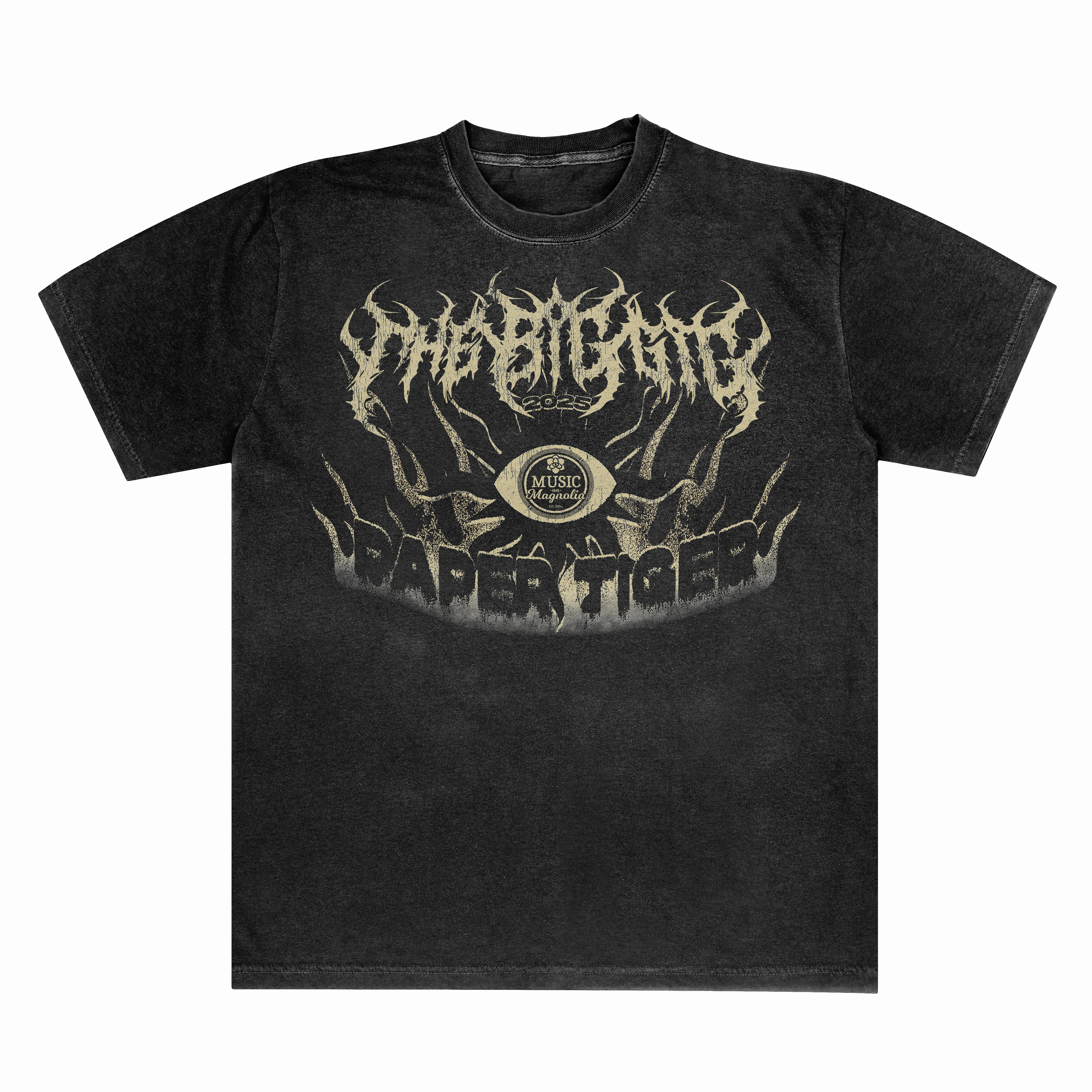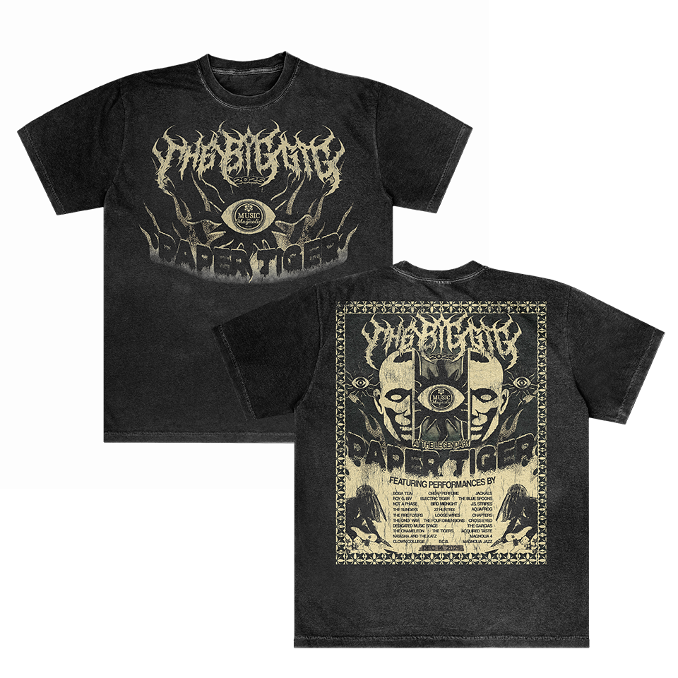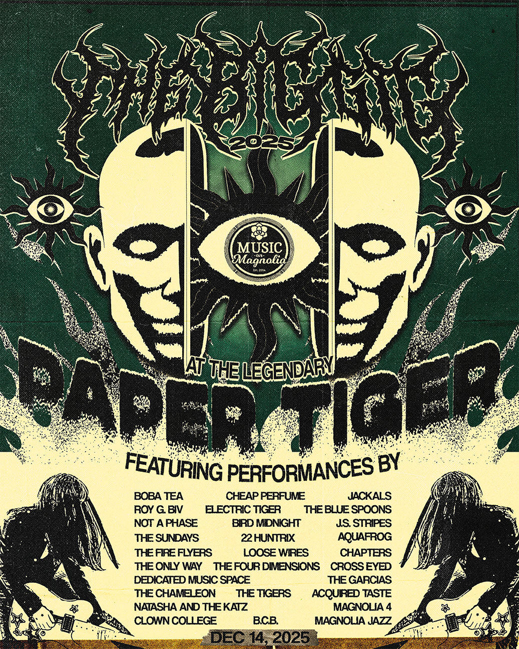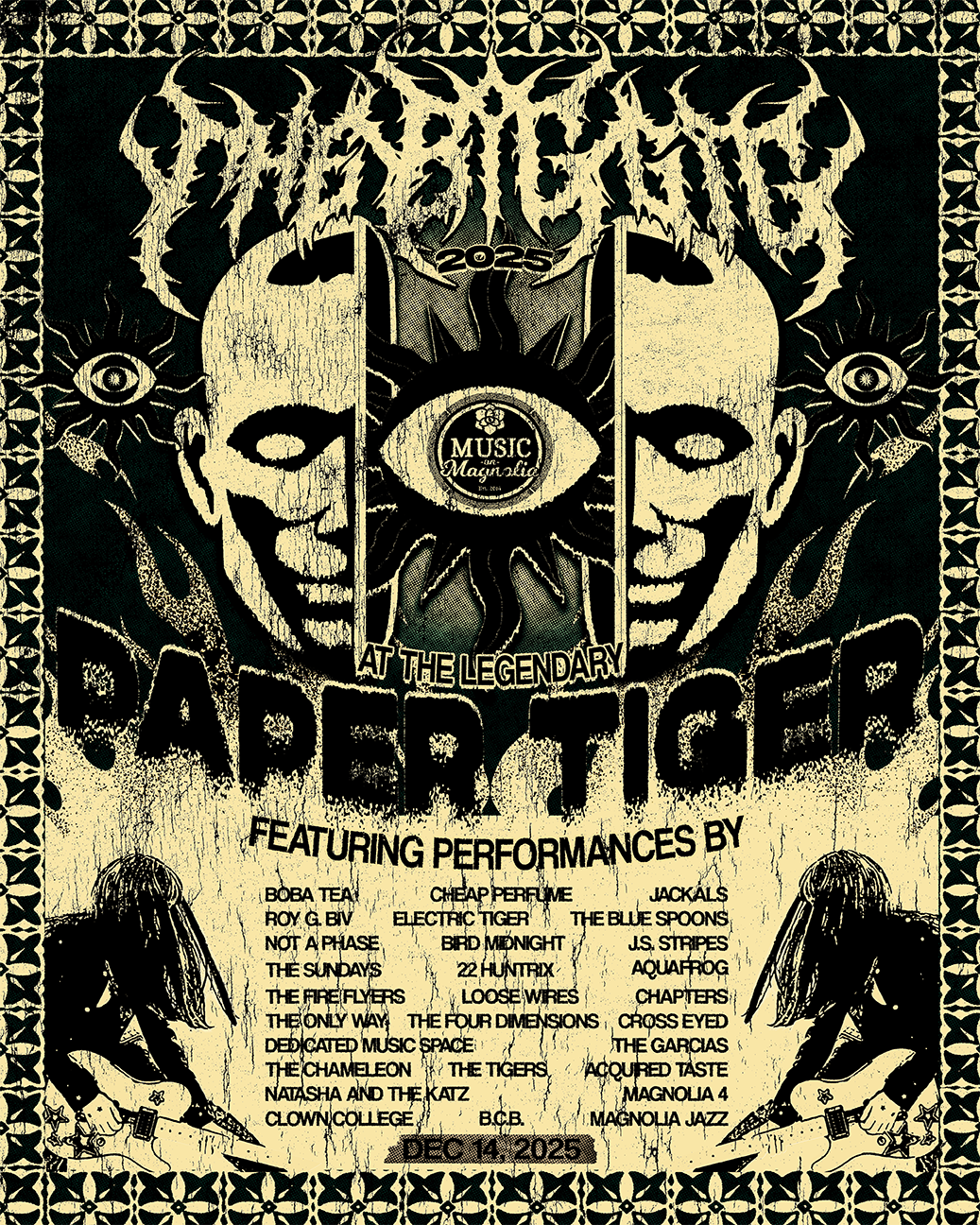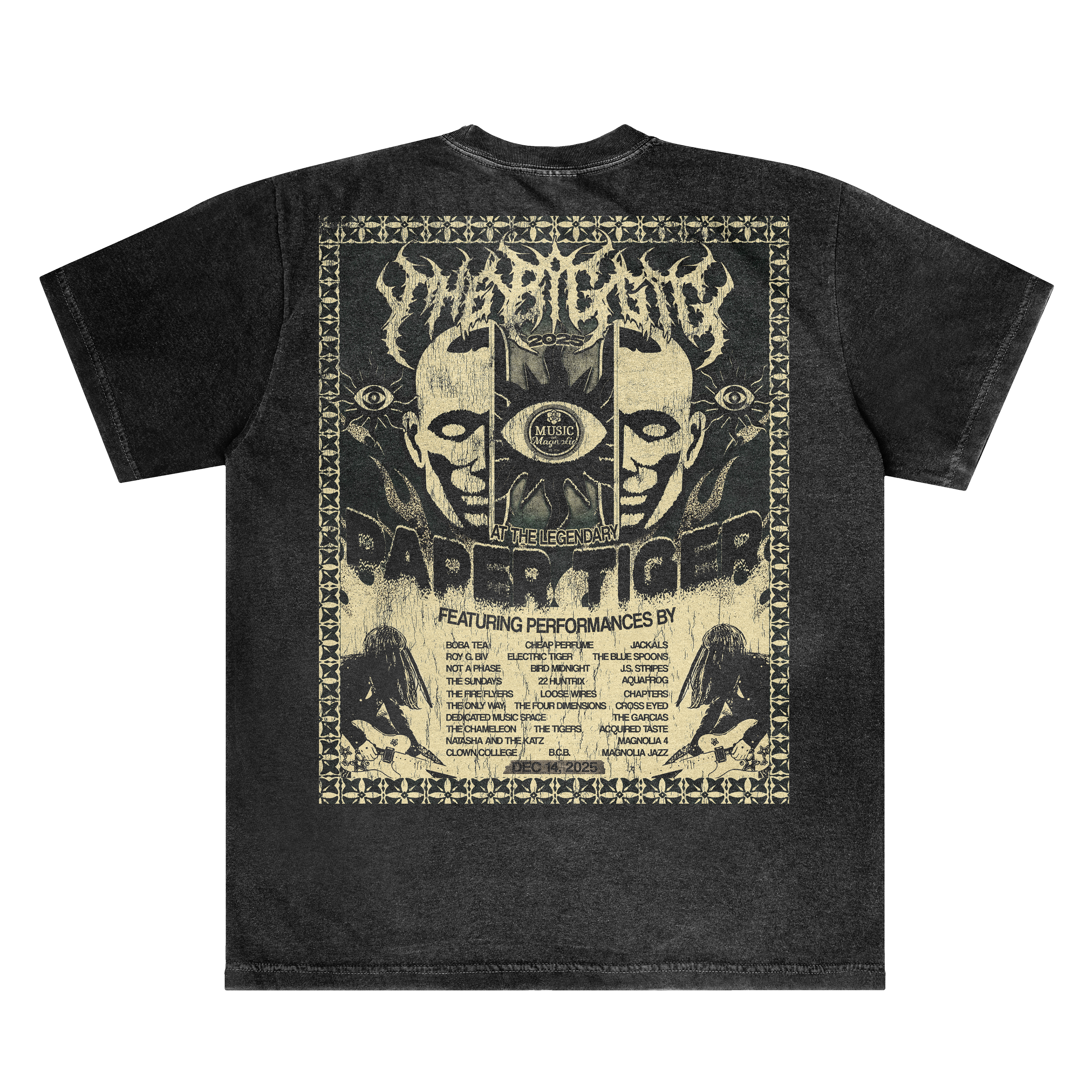 Social flyers and shirt design for Music on Magnolia's "BIG GIG 2025" at the Paper Tiger in San Antonio.